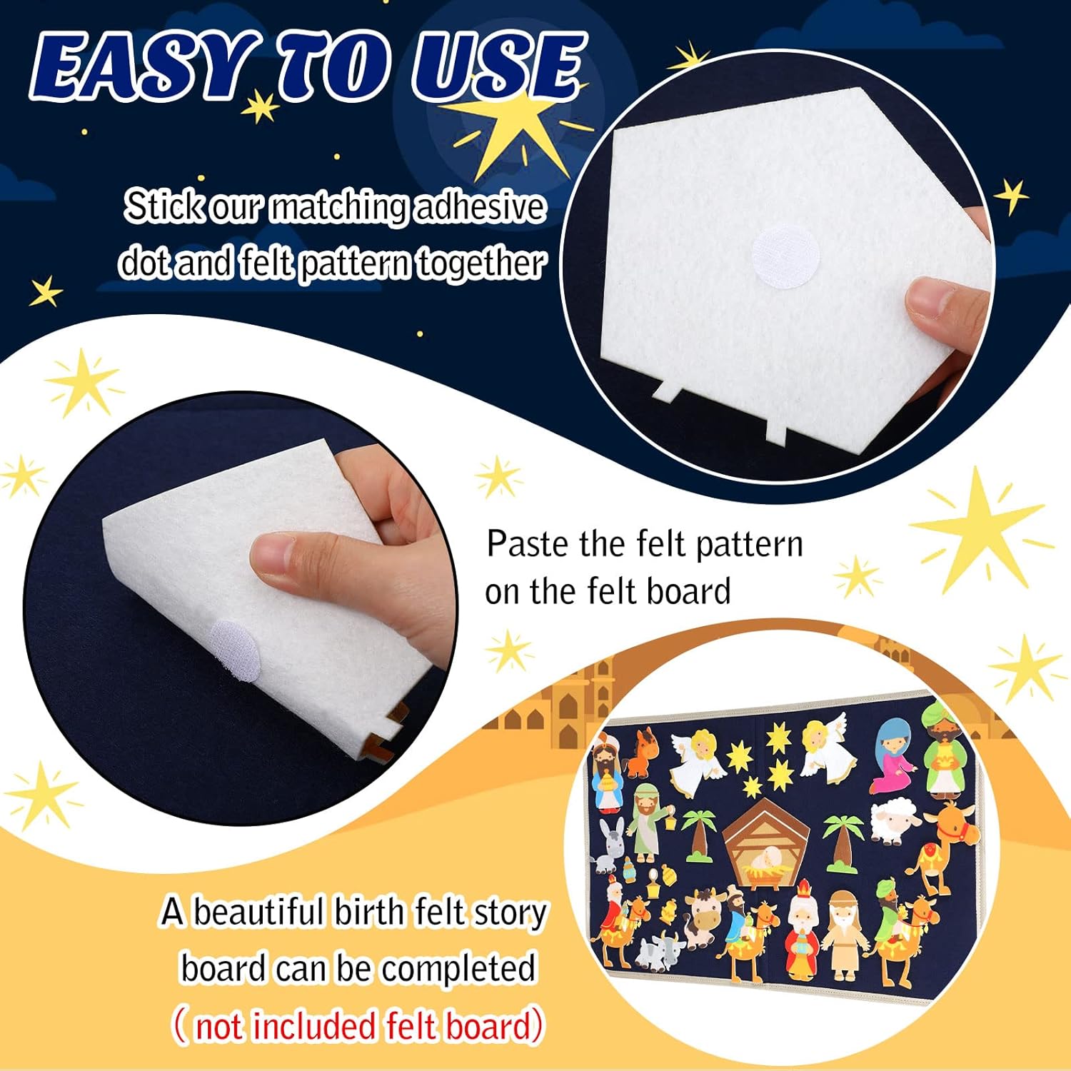 Features: The felt bible figures will be novel ornaments for felt boards (not included) at homes, bedrooms, classrooms, study rooms, clubs, offices and more, adding a fresh feeling. Also, these felt characters allow you to send as Christmas present to your family members, relatives, students, neighbors and significant others. Specifications: Material: felt Color: as shown in the pictures Size: as shown in the pictures Package includes: 33 x Felt figures Notes: Manual measurement, please allow slight errors on size. The color may exist a slight difference due to different screen displays. Not suitable for people younger than 12. Please note that felt board is not included.