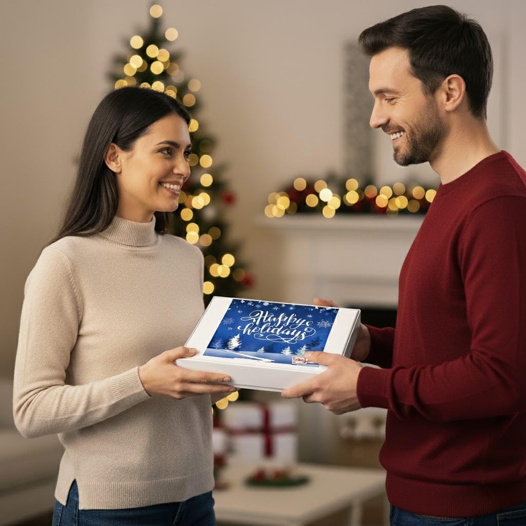 12 Delicious Happy Holidays Sugar cookies made from scratch using the finest ingredients, including fresh eggs and real vanilla. Printed with edible ink. These Winter Cookies are individually wrapped and carefully packed into a tray with plenty of bubble wrap for the ultimate protection while it makes its way to you. This Gourmet holiday gift basket will surely bring a smile to someone special of any age. Men, Women, children, boys or girls alike will enjoy this beautiful, fun set of cookies. Made in a Peanut Free and Tree Nut Free Facility. Kosher Dairy Made locally in the USA Ingredients: Flour, Sugar, Palm Oil, Butter, Eggs, Cane Molasses, Salt, Natural Flavor, Titanium Dioxide, Glycerine, Cellulose Gum, Ammonium Aluminum Sulfate, Corn Starch, Propylene Glycol, Artificial Colors, Sodium Benzoate